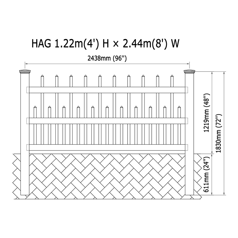 | Piquete | 1 1/2 "x 1 1/2" x 40 '' x 21pcs (espaçamento padrão) |